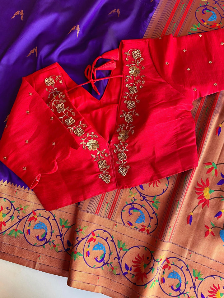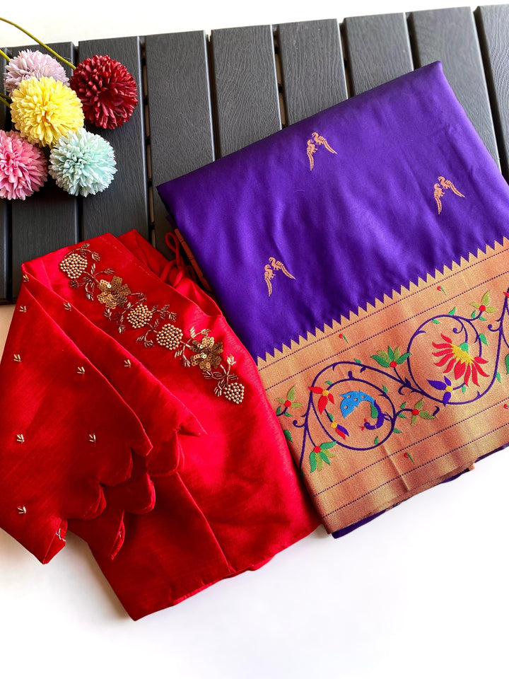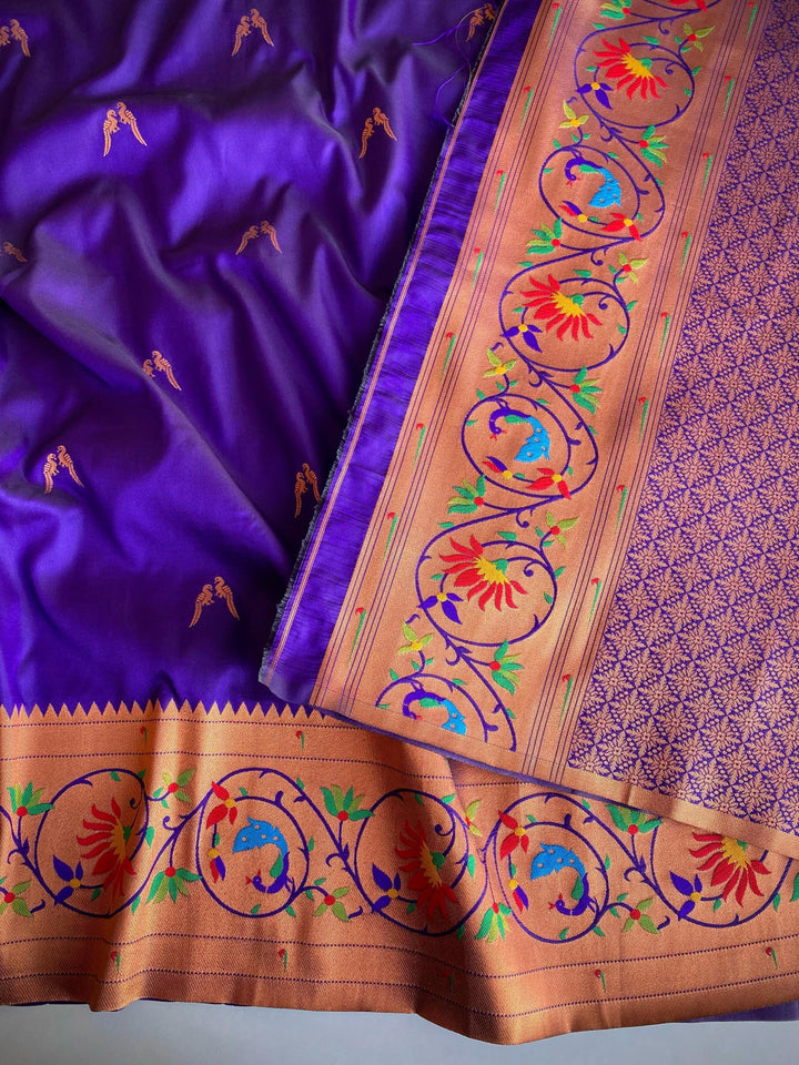 Pure paithani silk sarees with traditional weaving patterns all over with peacock butti on the body and a rich contrast pallu with tassels attached.