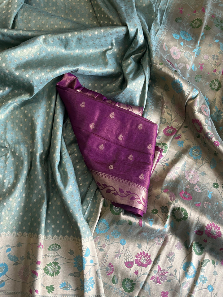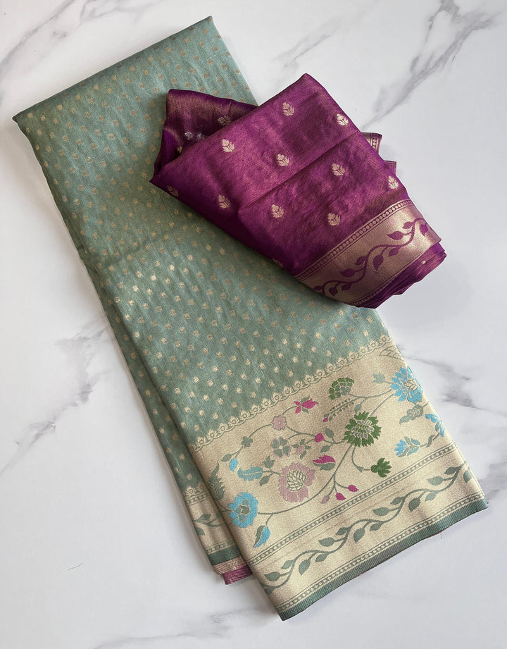 Teamed with contrast weaving motifs blouse piece having Paithani border