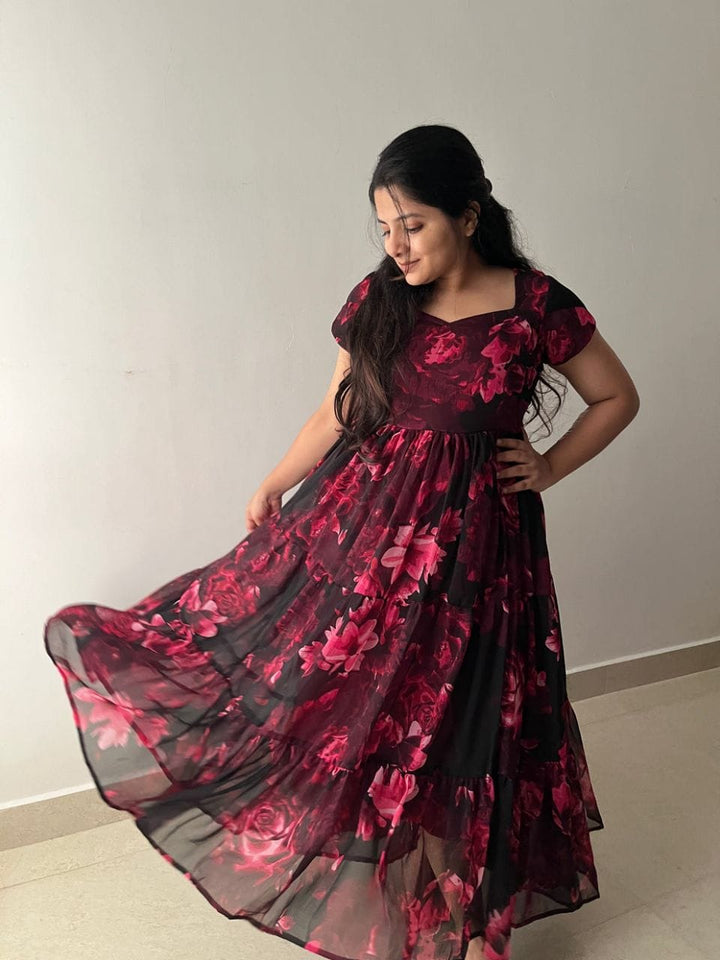 Designer Frill Flared Gown in Fox Georgette with Complete Lining