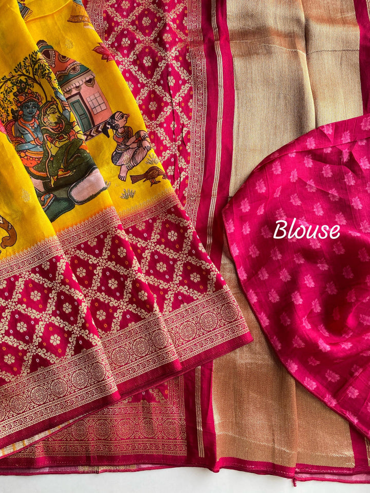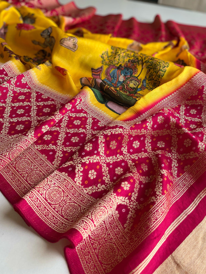 Pure Viscose Crape Georgette saree featuring all-over placement Kalamkari & Bandhani fusion prints ✨