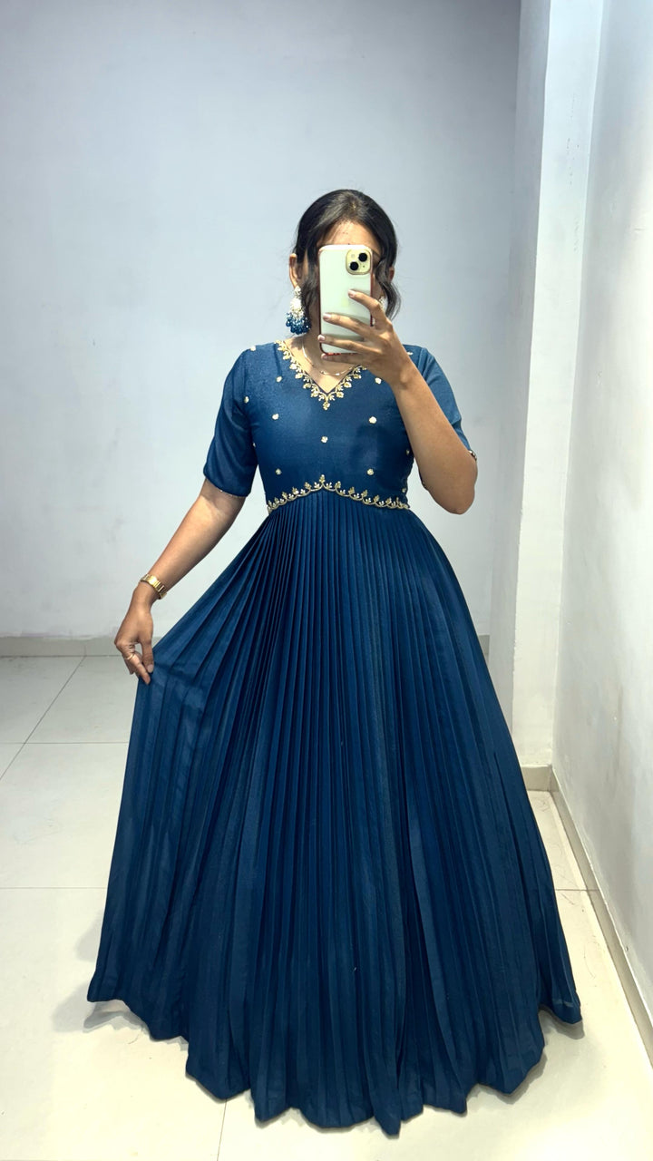 Maggam edition!!! Look at our morpinchh color full length dress with hand embroidered neckline !! Its beautiful star georgette dress with glittery shine !duppta is adding more charm to the look!!