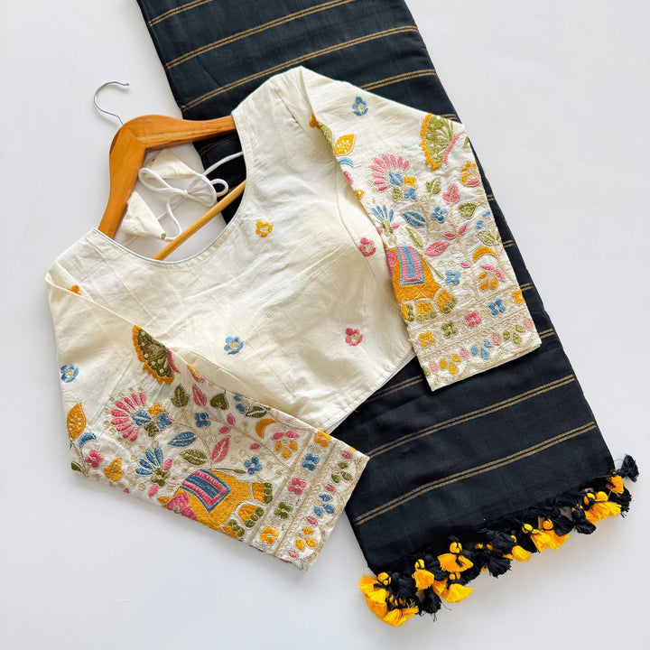 Drape yourself in heritage charm with our stunning Khadi Jari Cotton Saree, adorned with beautiful handmade latkans