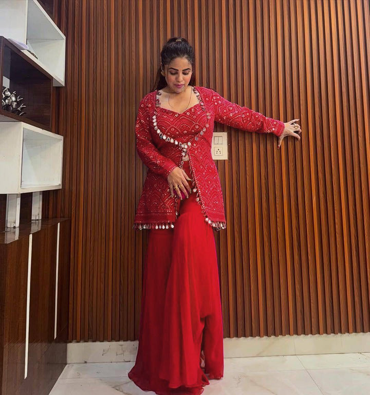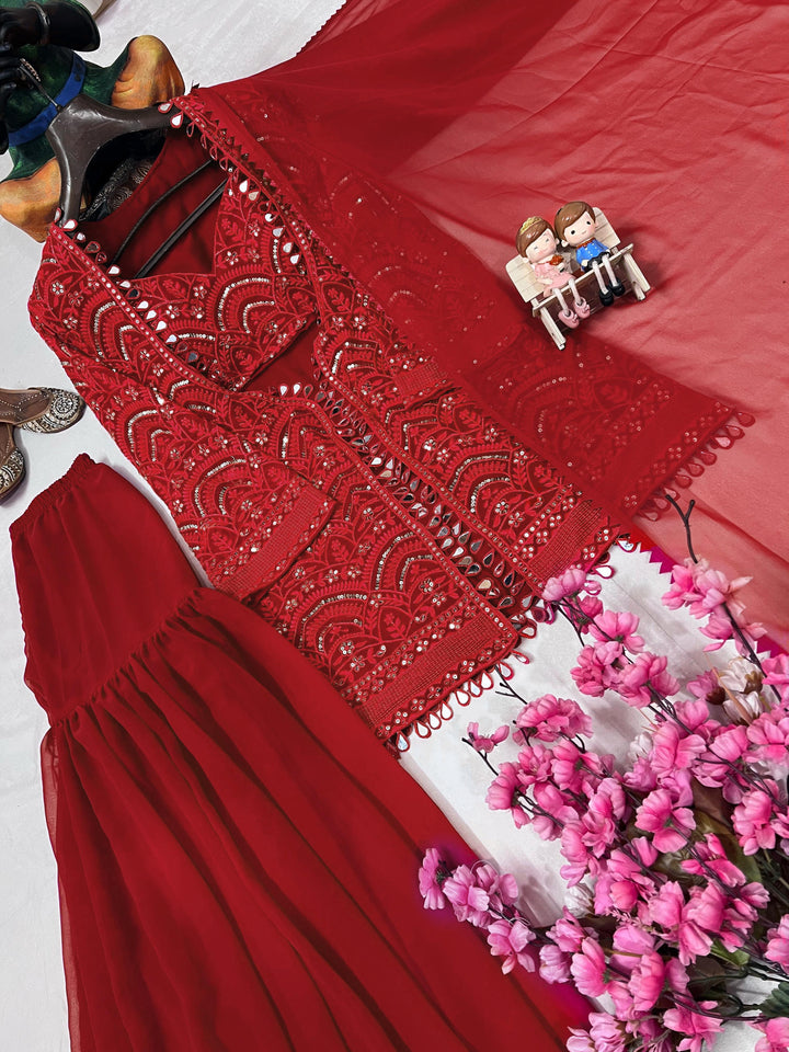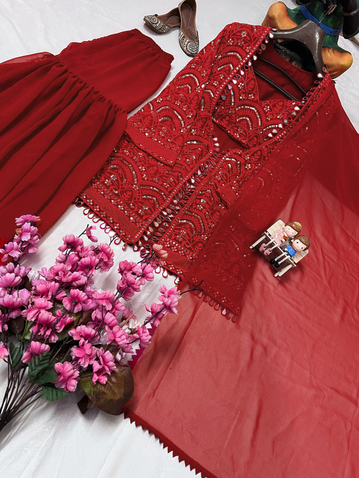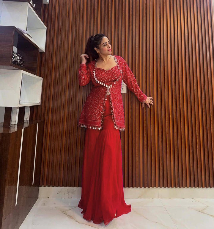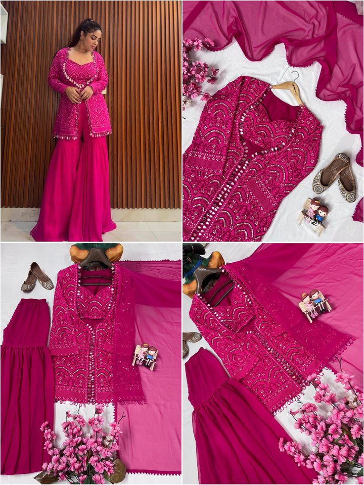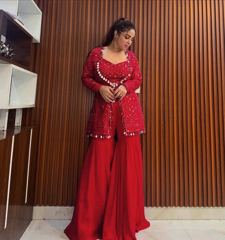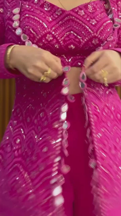 Premium Georgette Sharara Set with Embroidered Jacket, Real Mirror Work & Dupatta
