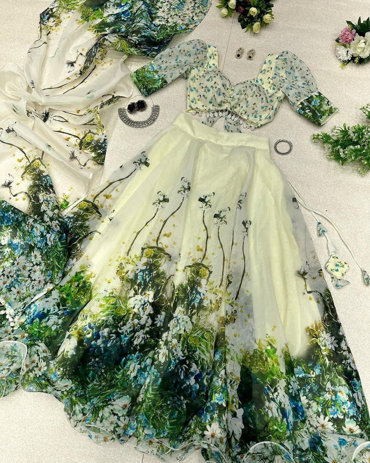 🌸 Lehenga – Pure Jimmy Organza Silk, digital printed, 8 mtr flair with canvas patta.