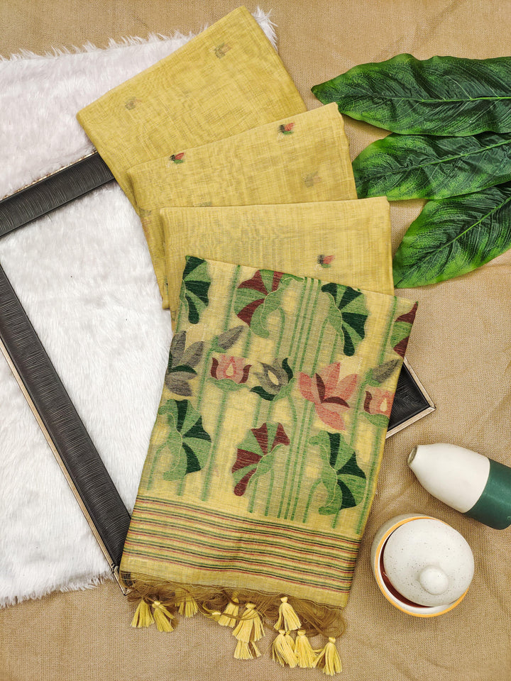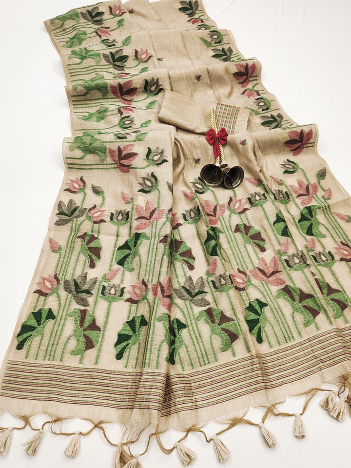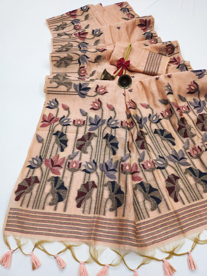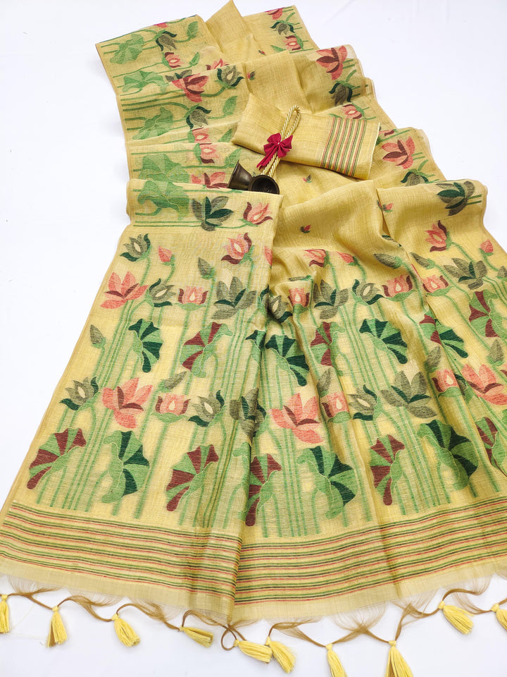 Premium soft Muga Cotton saree with classic colourfull resham weaving jamdani type pallu with very decent colours and traditional lotus weaving border and all over resham weaving butties and fancy tassels with running blouse piece