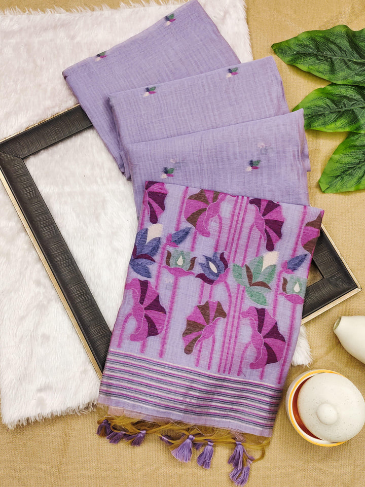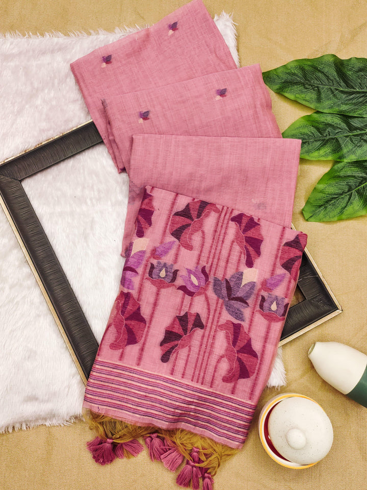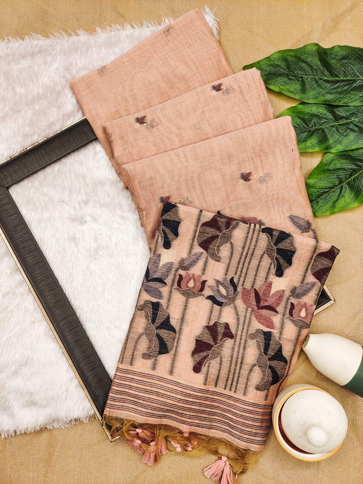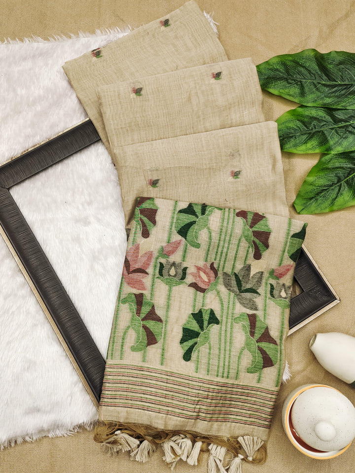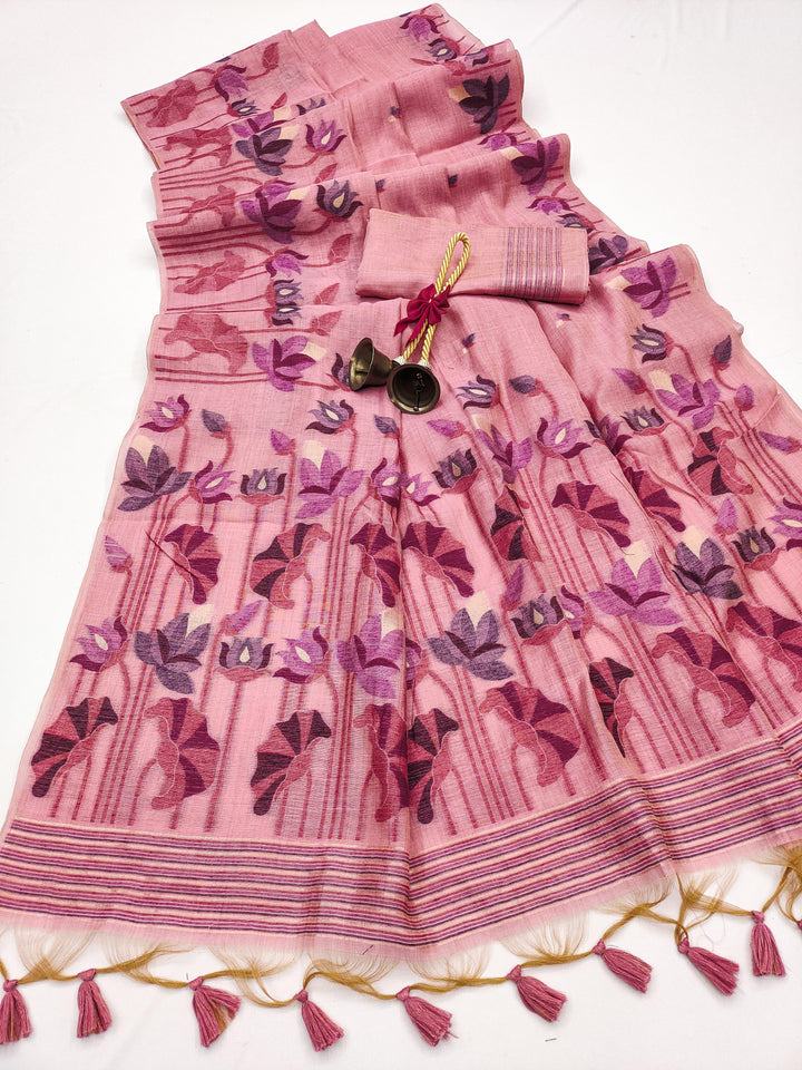 Premium soft Muga Cotton saree with classic colourfull resham weaving jamdani type pallu with very decent colours and traditional lotus weaving border and all over resham weaving butties and fancy tassels with running blouse piece