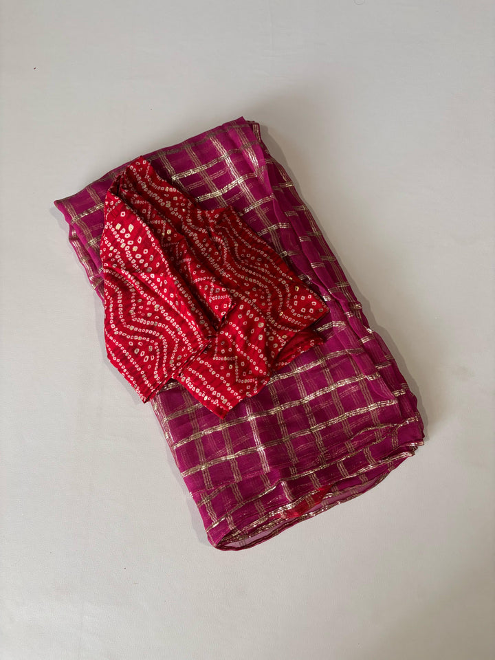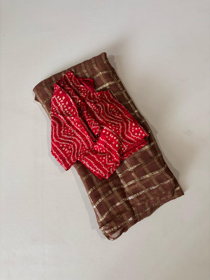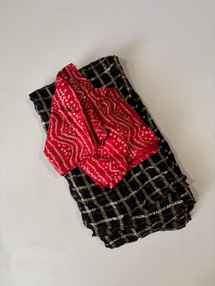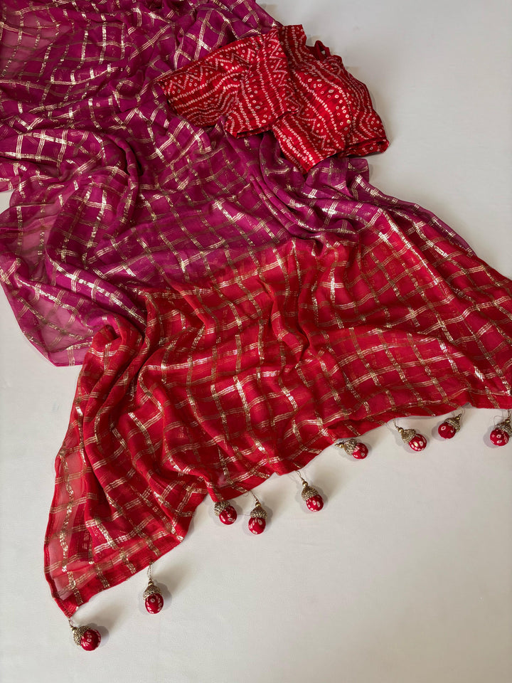 Pure georgette saree with zari-woven chex and tie-dye contrast red pallu. Features a beautifully matched Bandhani cotton blouse and specially designed Bandhani jumkas. Saree length: 5.5 meters | Blouse: 1 meter.