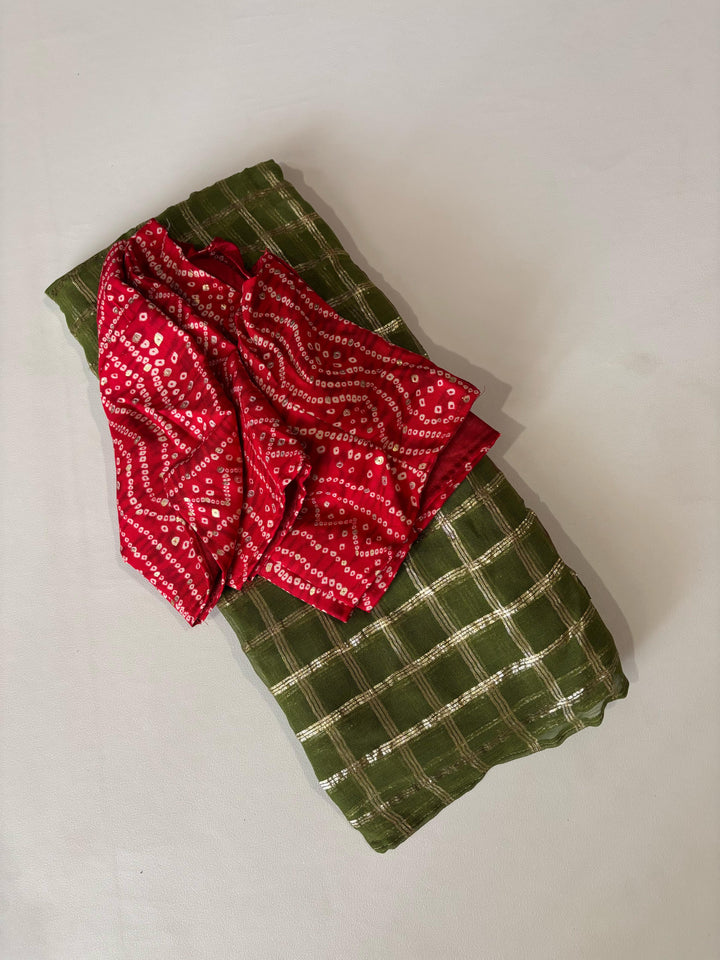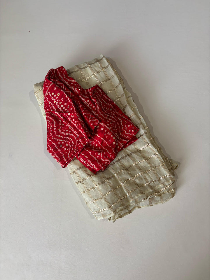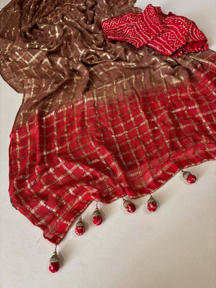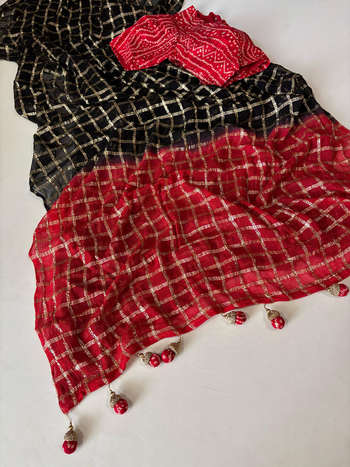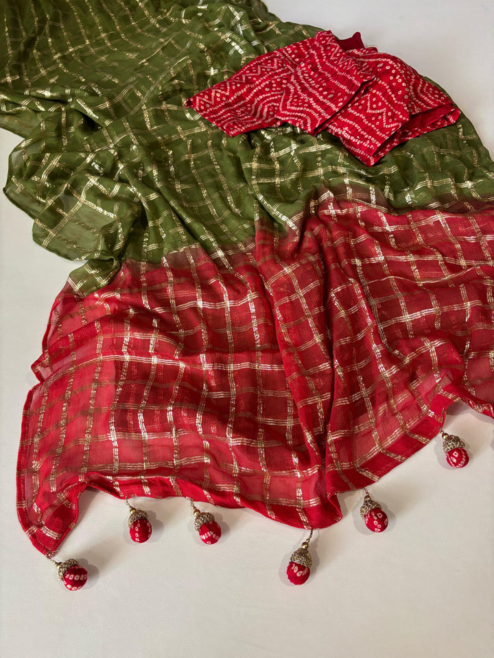 Pure georgette saree with zari-woven chex and tie-dye contrast red pallu. Features a beautifully matched Bandhani cotton blouse and specially designed Bandhani jumkas. Saree length: 5.5 meters | Blouse: 1 meter.