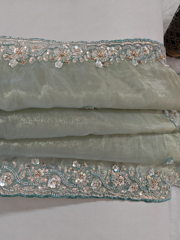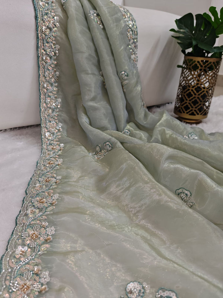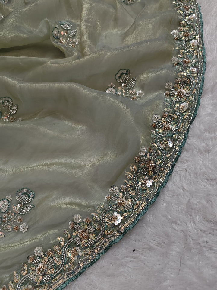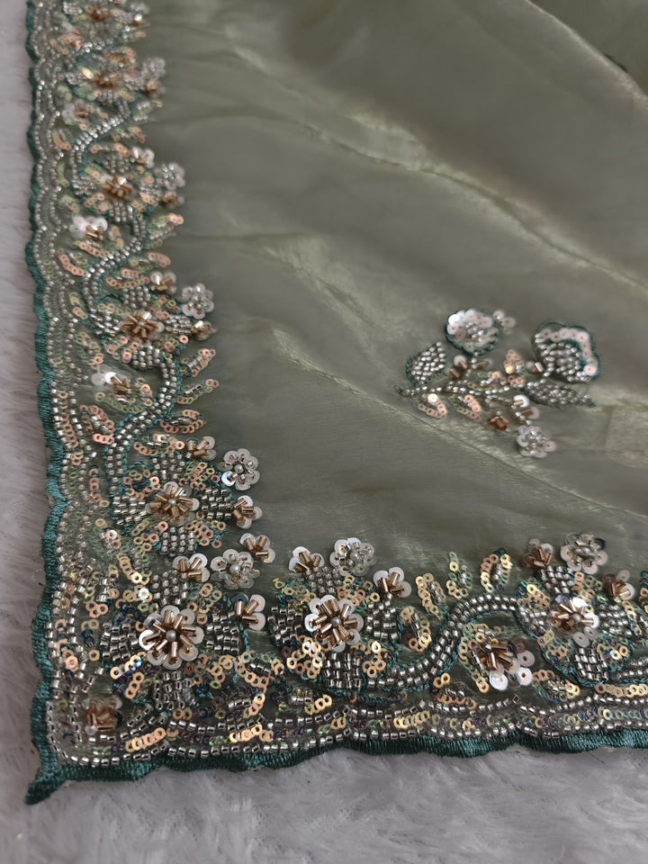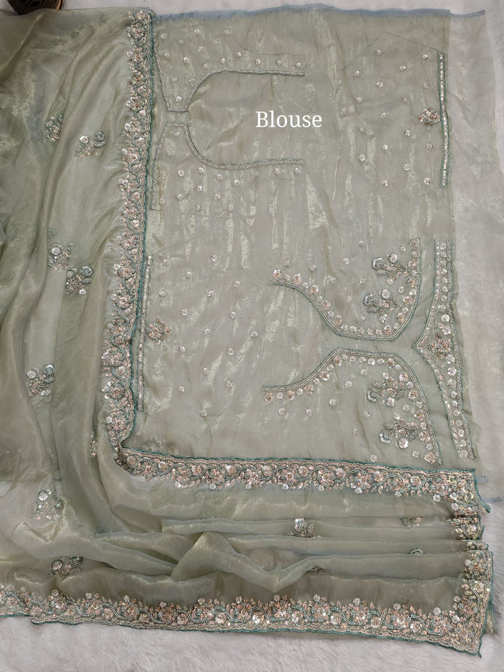 Mint color shimmer glass organza saree with hand work using sequins, cutdana and pearls. Blouse has work on both sides and sleeves.