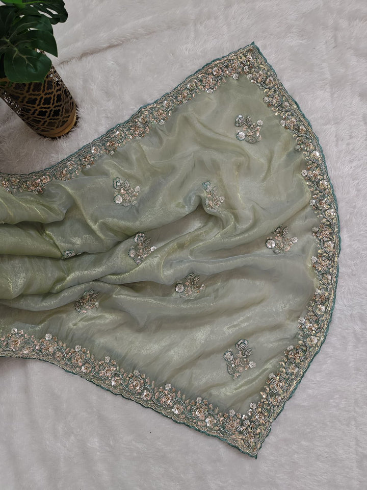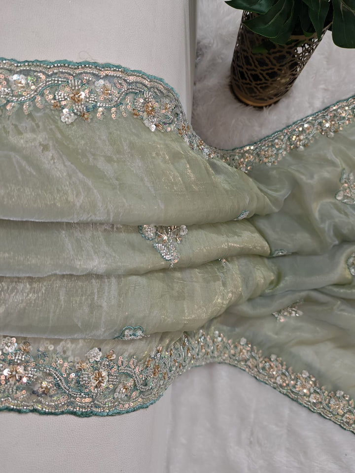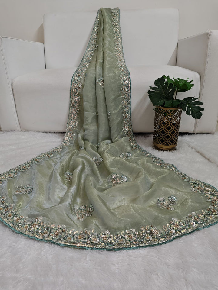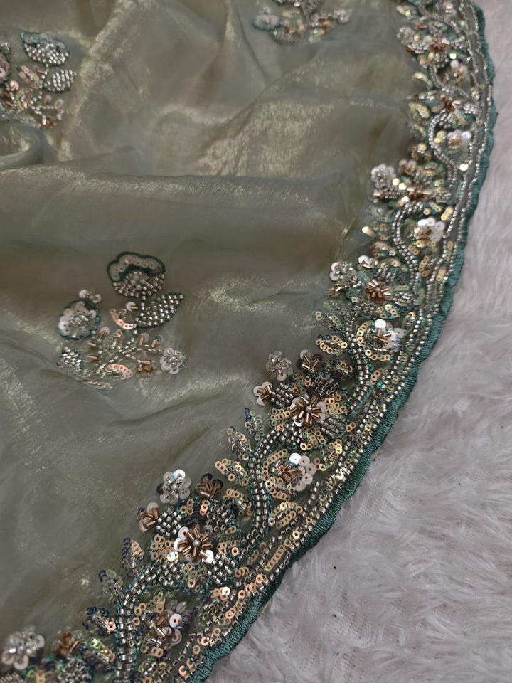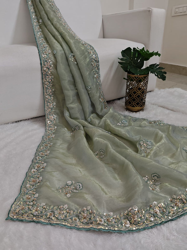 Mint color shimmer glass organza saree with hand work using sequins, cutdana and pearls. Blouse has work on both sides and sleeves.