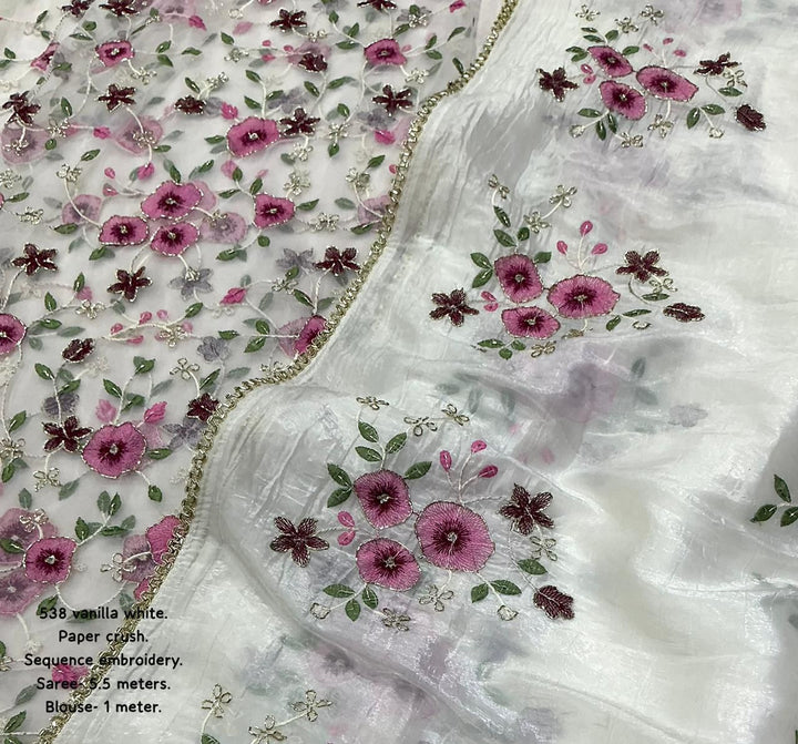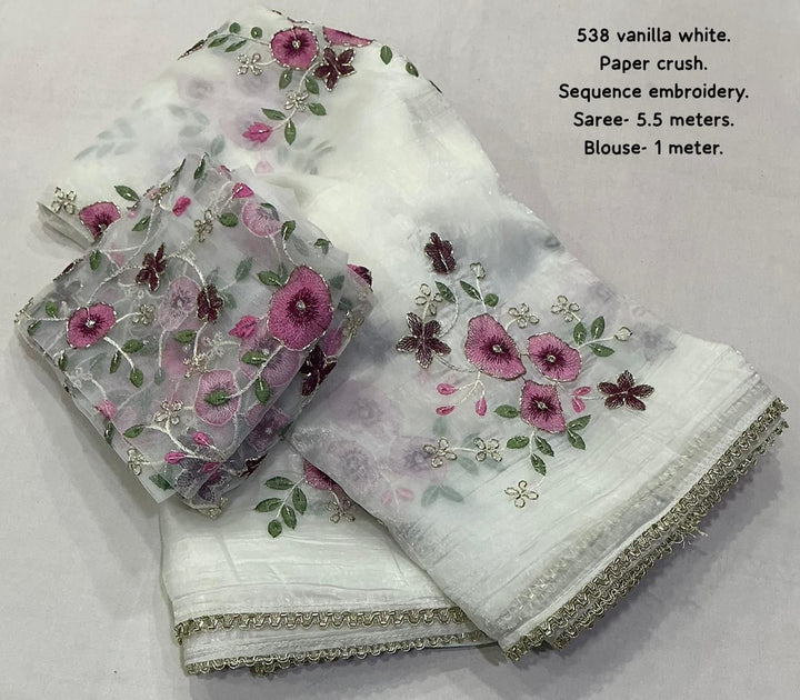 Soft paper crush saree with thread flower embroidery with verl sequence outings.