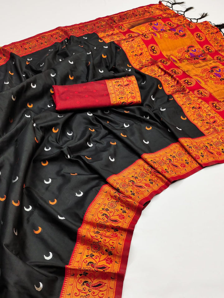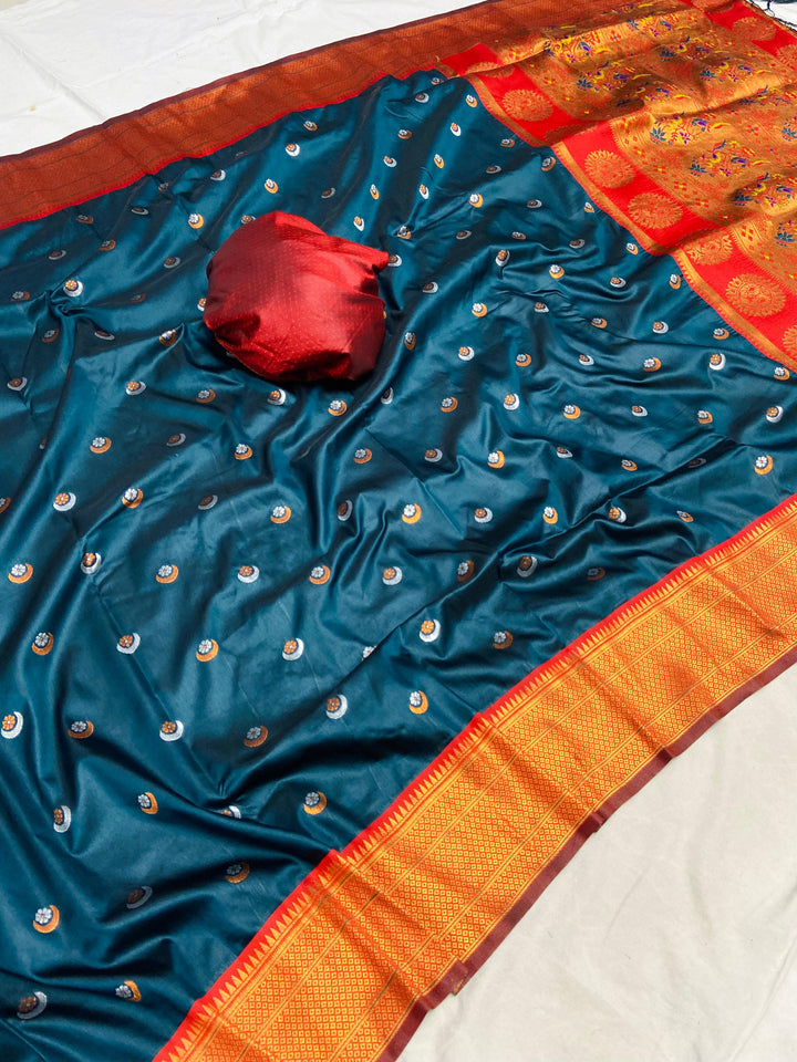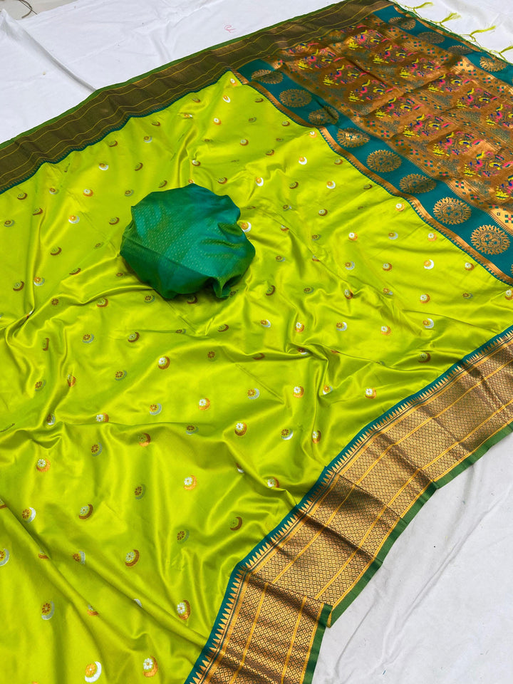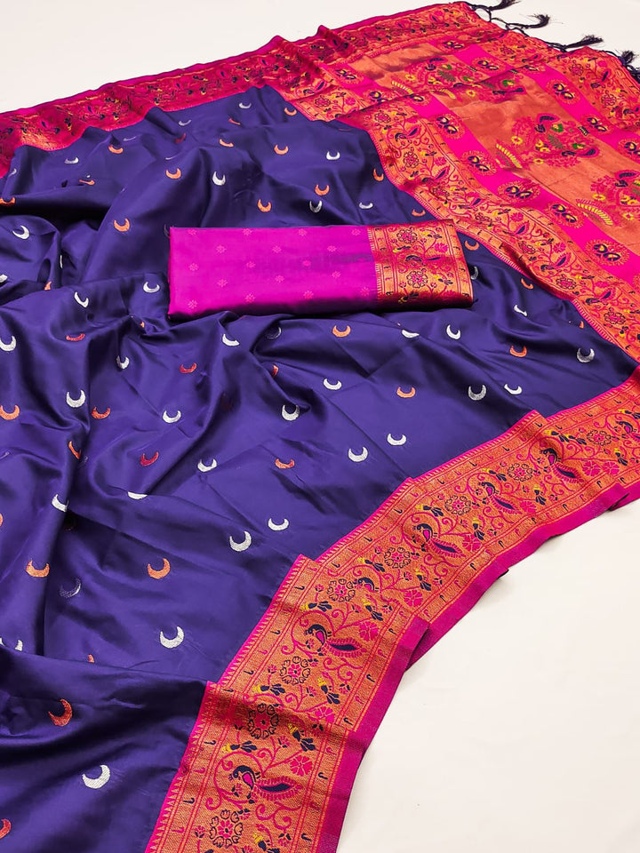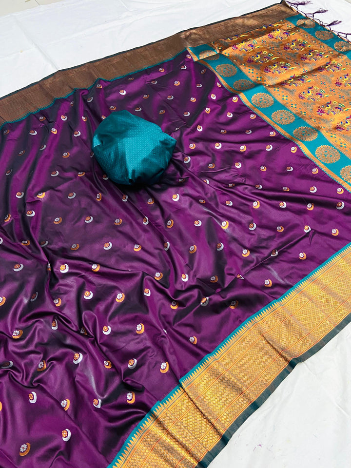 Soft Silk sarees with Chaand weaves all over the body having Rich woven Paithani meenakari pallu and picock Mina weaving work border with brocade blouse as shown with beautiful tusals