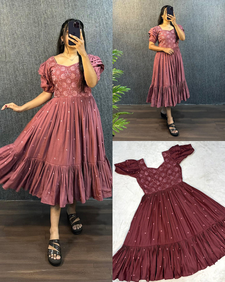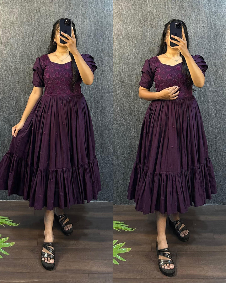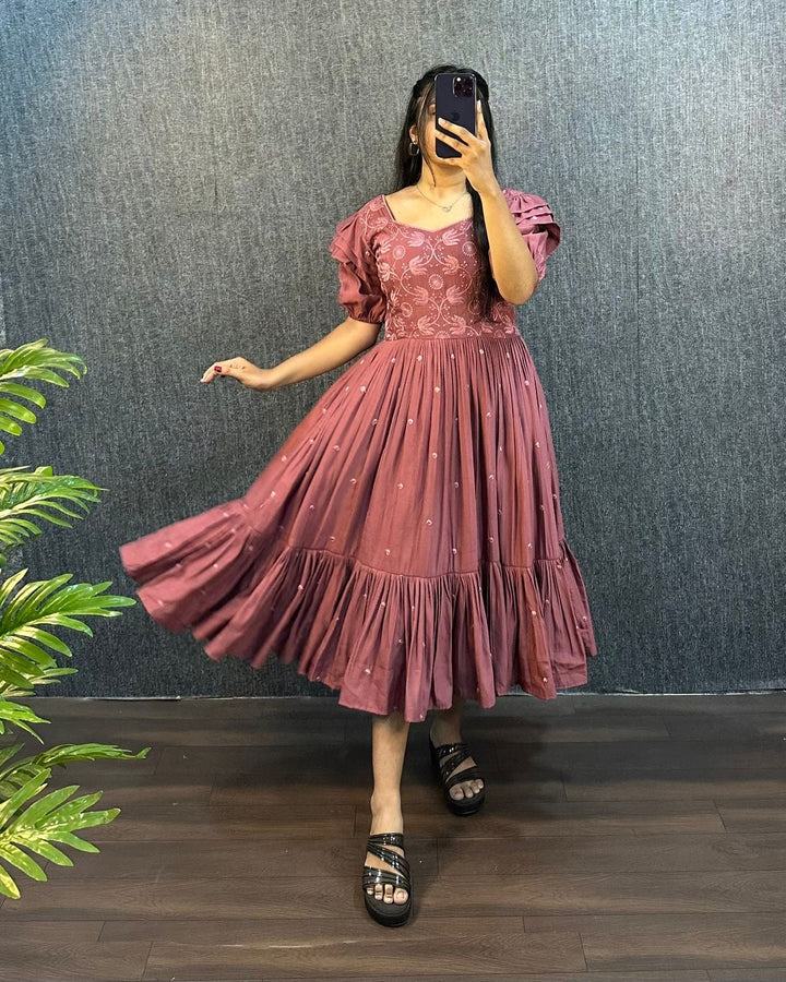 Explore the unique style of Sundari work gowns from the Tripura Sundari catalogue. Made with high-quality South silk pure cotton fabric, these gowns are 45+ inches in length and have 9+ inch sleeve lengths for a comfortable fit. The added micro lining ensures a smooth and polished finish.
