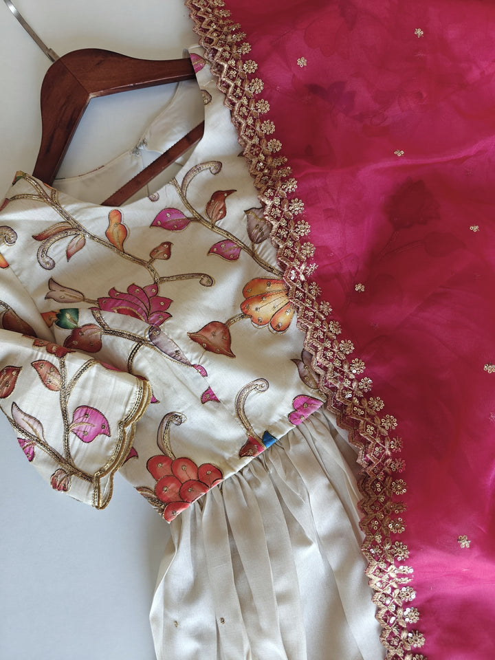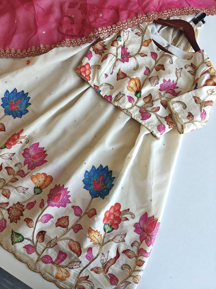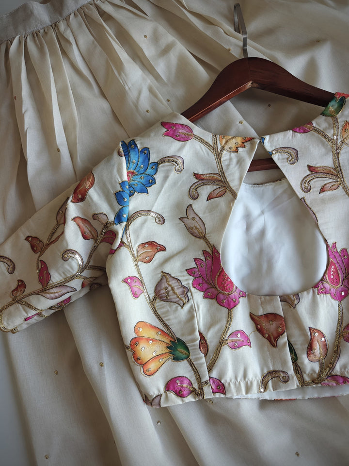 Pure tussar silk lehenga with a beautiful combination of position printing and embroidery all over the lehenga.