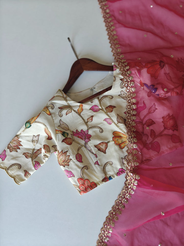 Beautiful stitched blouse with pattern and with beautiful contrast embroidered dupatta.