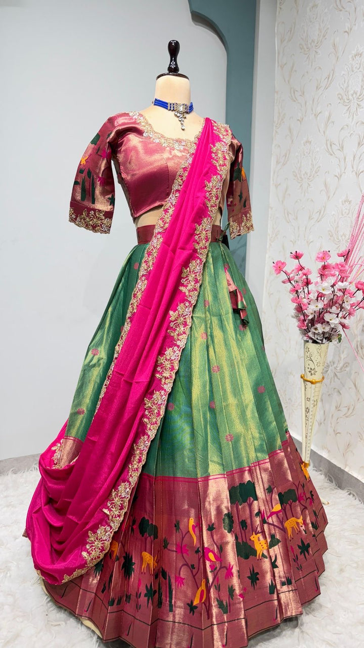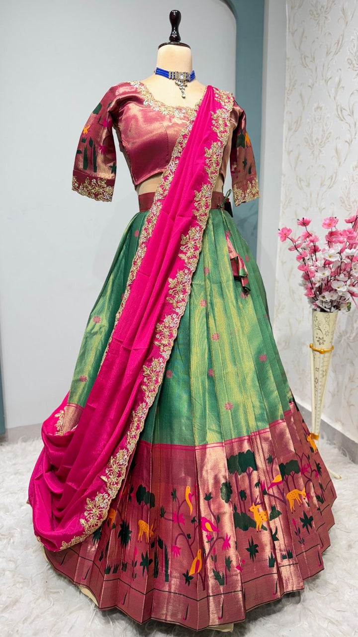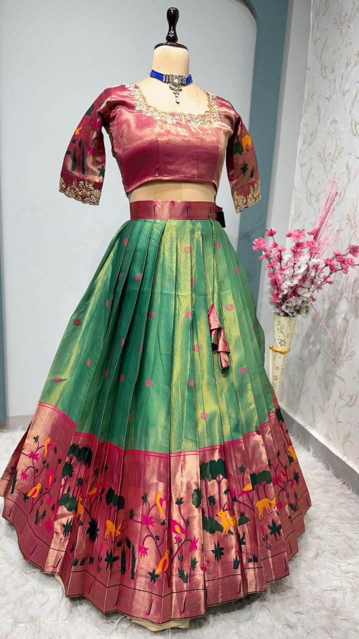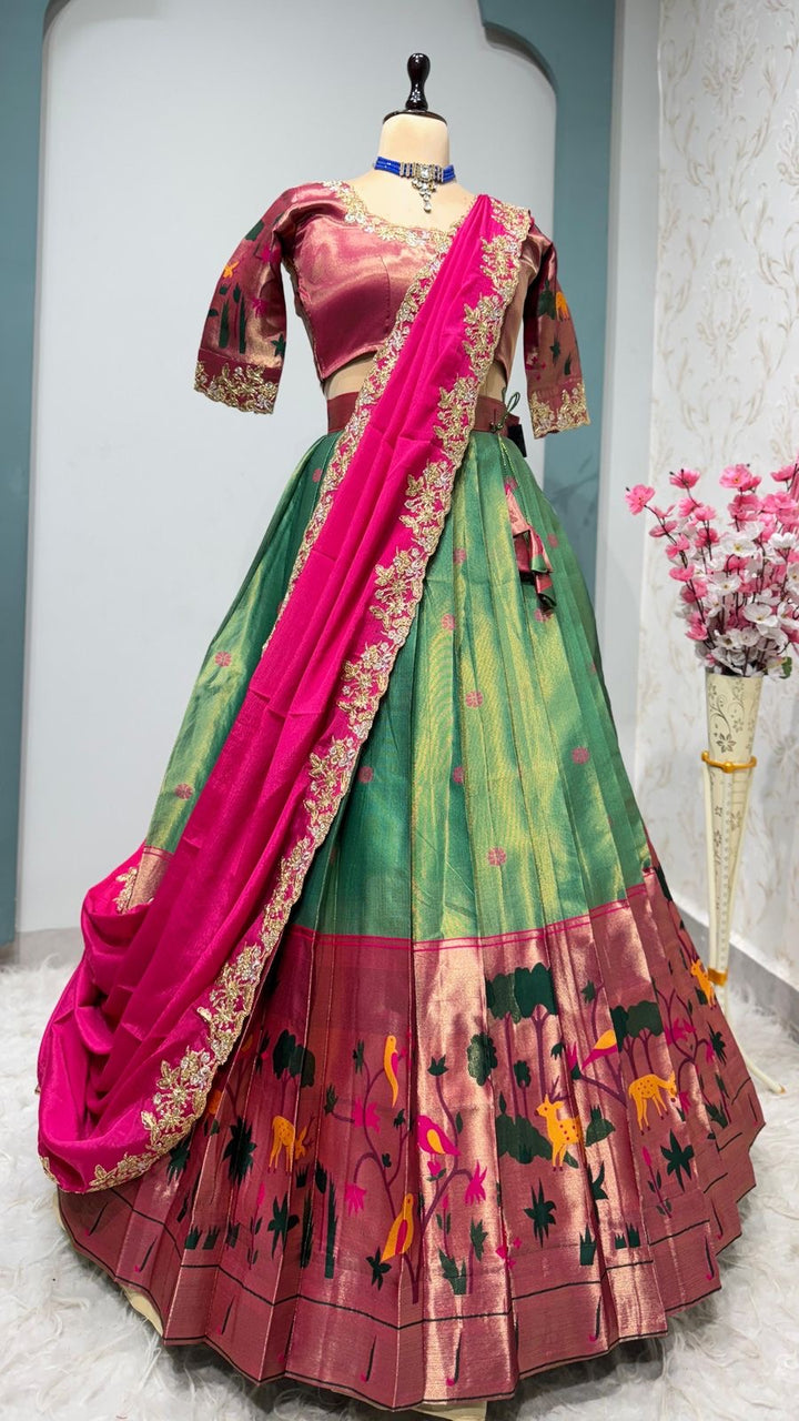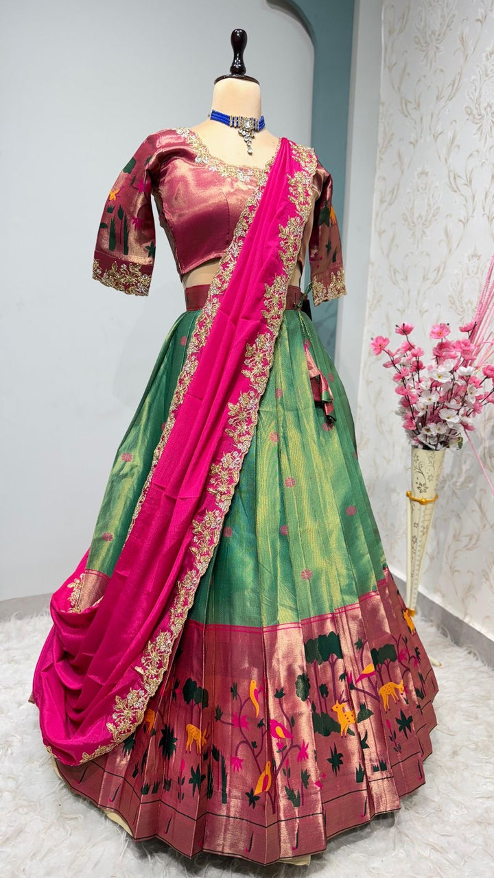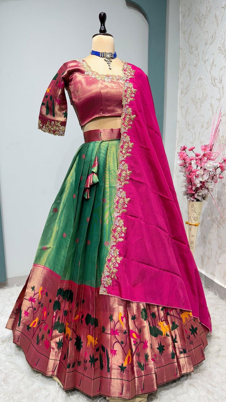 This exquisite Two tone Paithani silk lehenga showcases a harmonious blend of vibrant colors and luxurious fabric. The lehenga features a stunning green border that elegantly frames the flowing silhouette, enhancing its overall appeal. Perfect for festive occasions or weddings, this attire combines traditional craftsmanship with contemporary style, making it a must-have addition to any wardrobe. The soft silk material ensures comfort while exuding sophistication, allowing the wearer to make a striking impression.