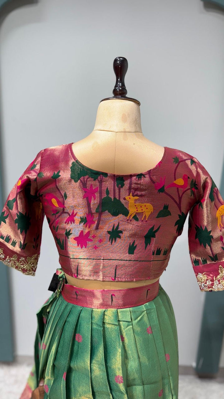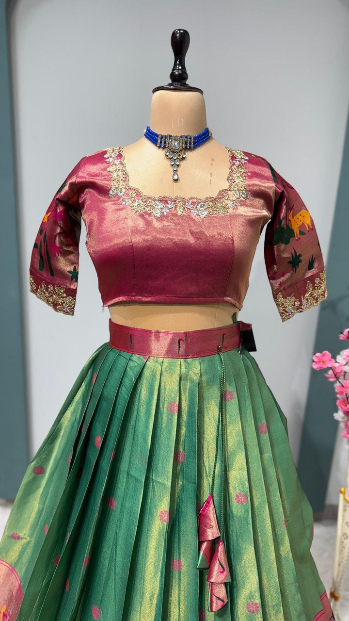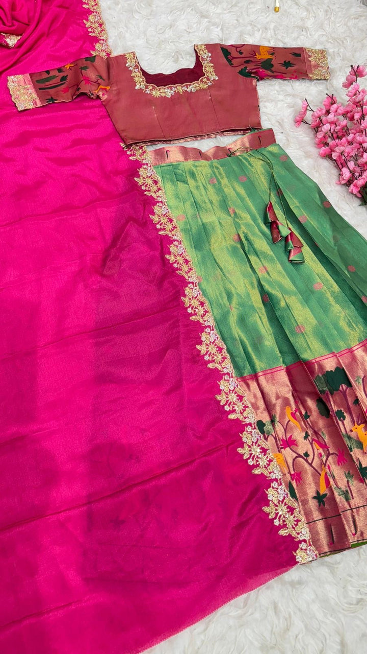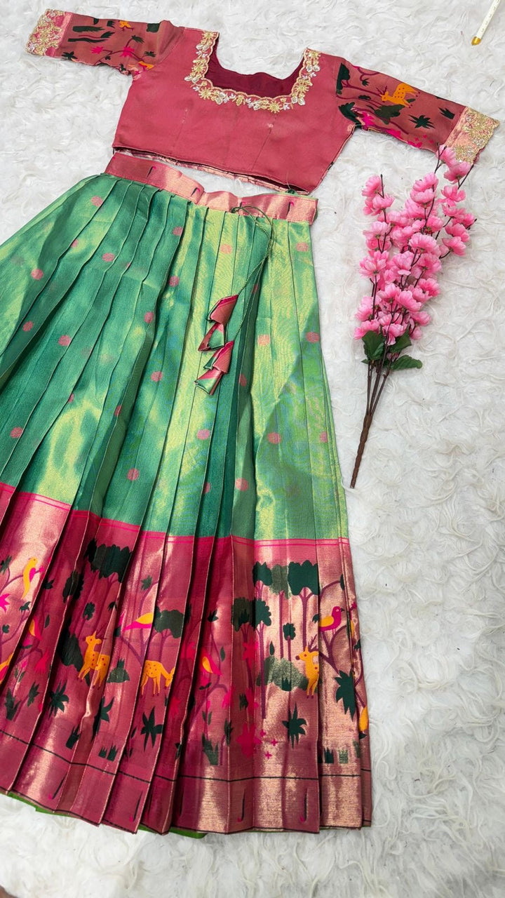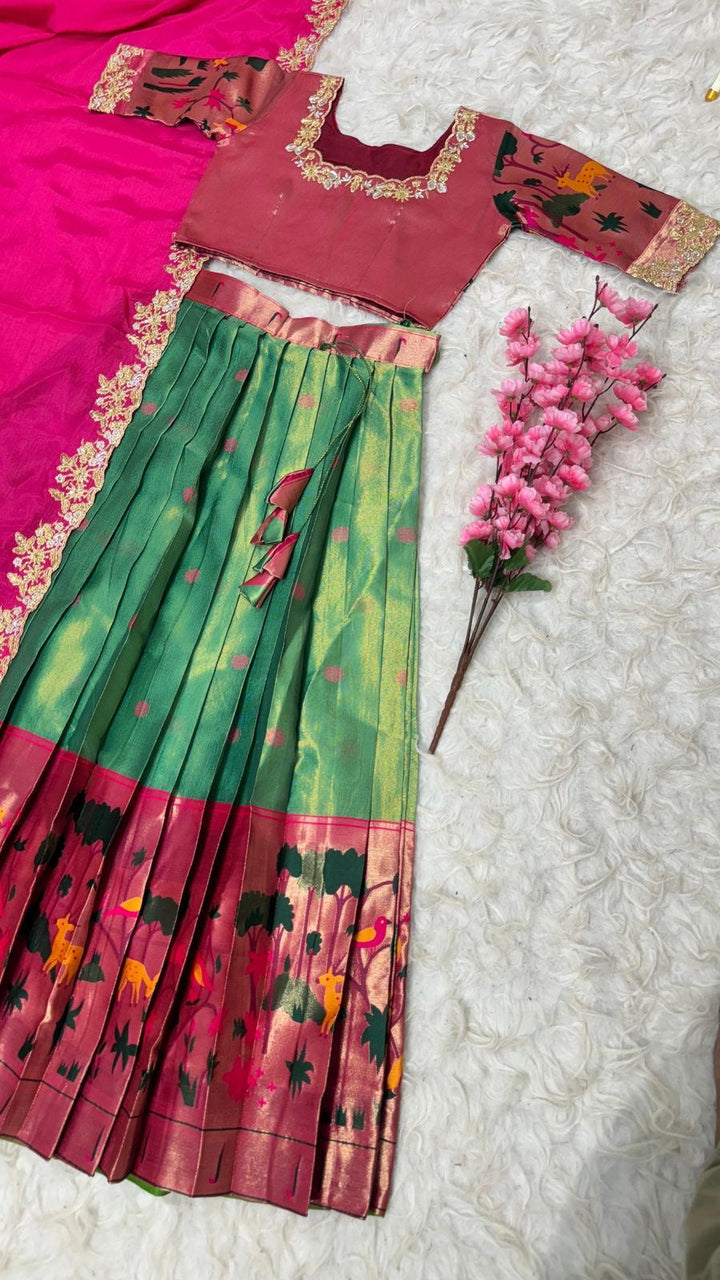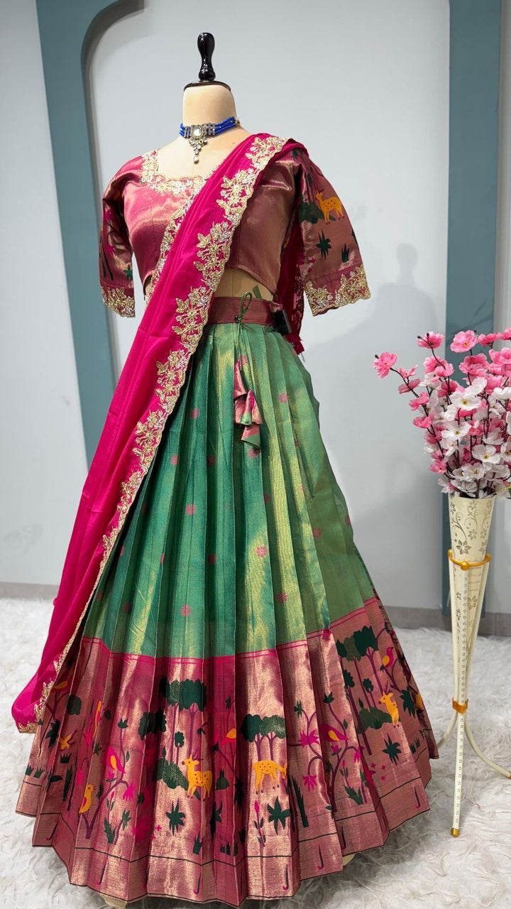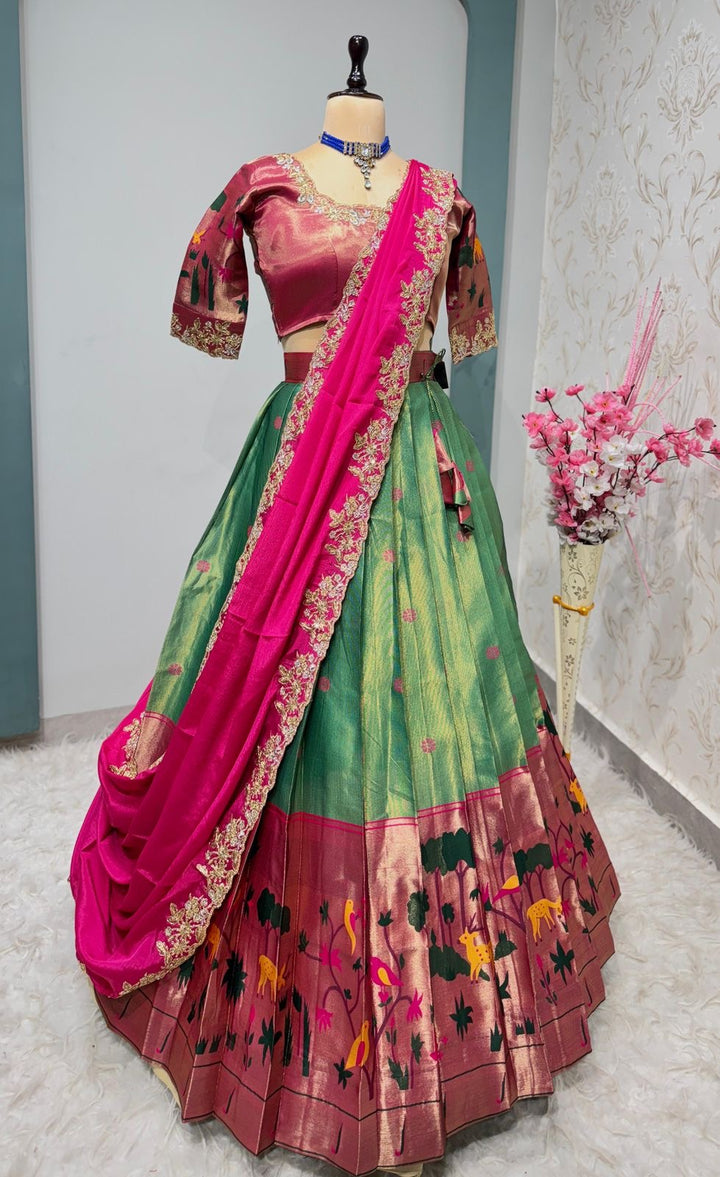 This exquisite Two tone Paithani silk lehenga showcases a harmonious blend of vibrant colors and luxurious fabric. The lehenga features a stunning green border that elegantly frames the flowing silhouette, enhancing its overall appeal. Perfect for festive occasions or weddings, this attire combines traditional craftsmanship with contemporary style, making it a must-have addition to any wardrobe. The soft silk material ensures comfort while exuding sophistication, allowing the wearer to make a striking impression.