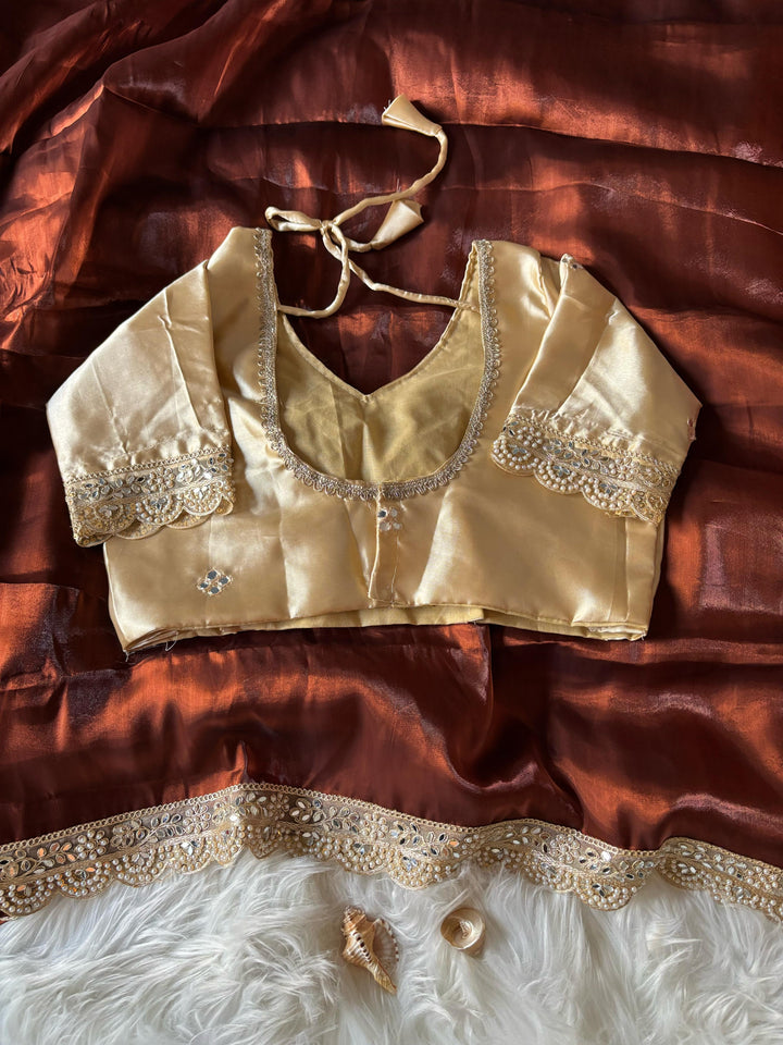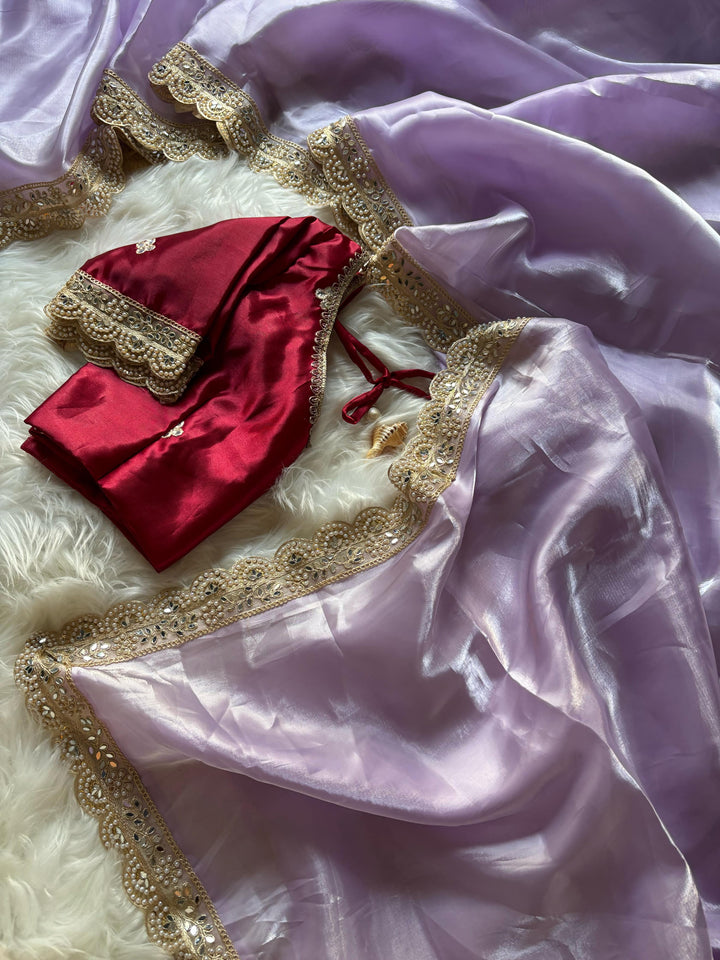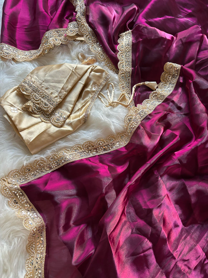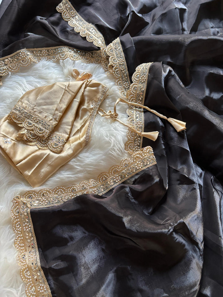 Trending chocolate color glass satin Jimmychoo saree with elegant embroidery cutwork lace, pearl handwork, and mirror work. Paired with a fully embroidered mirror work satin blouse.